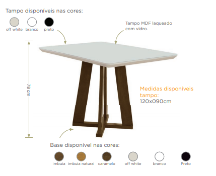 Medias disponíveis no tampo: 120 x 90 cm