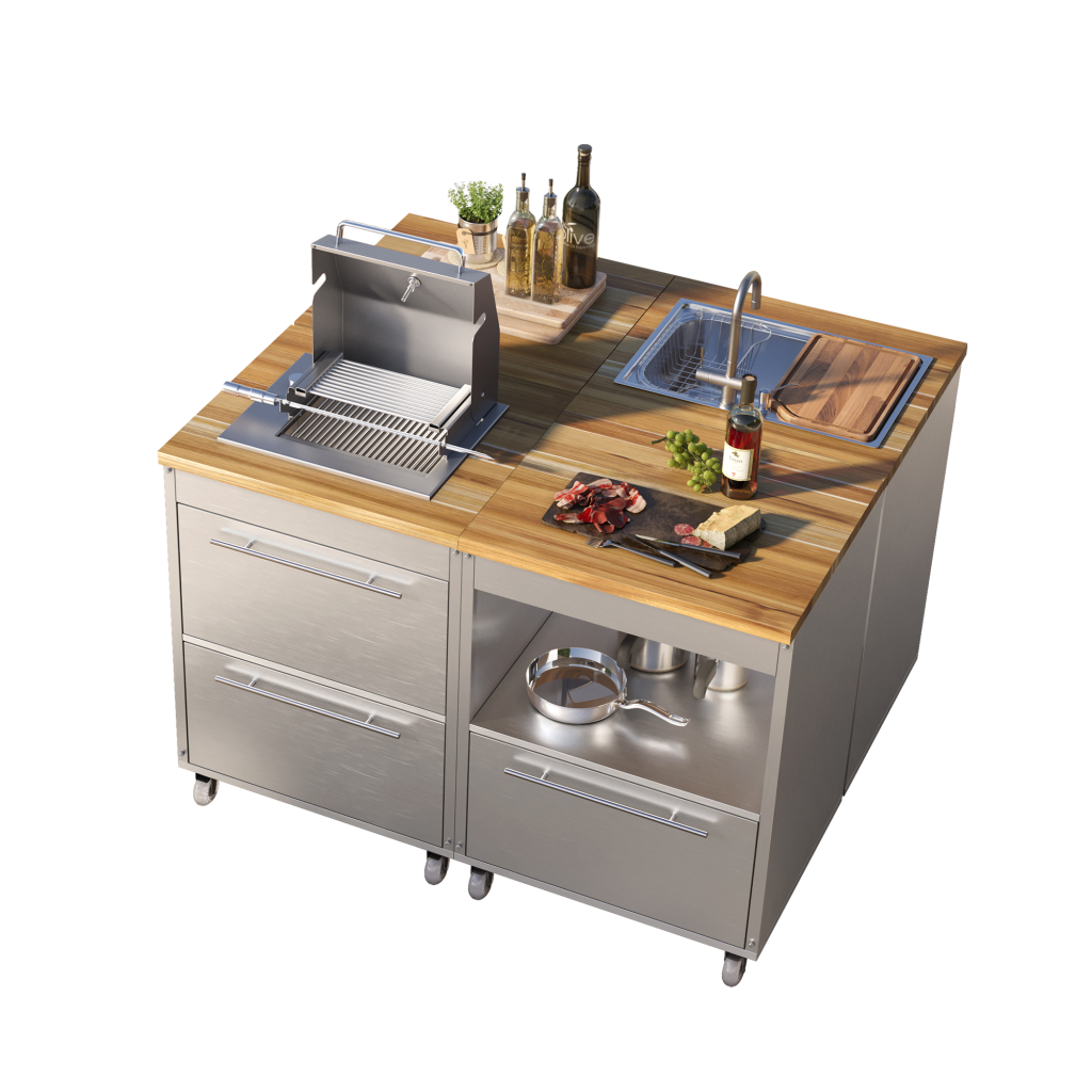 Os módulos volantes são o grande diferencial da Steel Kube. Desenvolvidos em estrutura 100% aço inox, eles oferecem mobilidade, versatilidade e design contemporâneo para cozinhas e áreas gourmet.